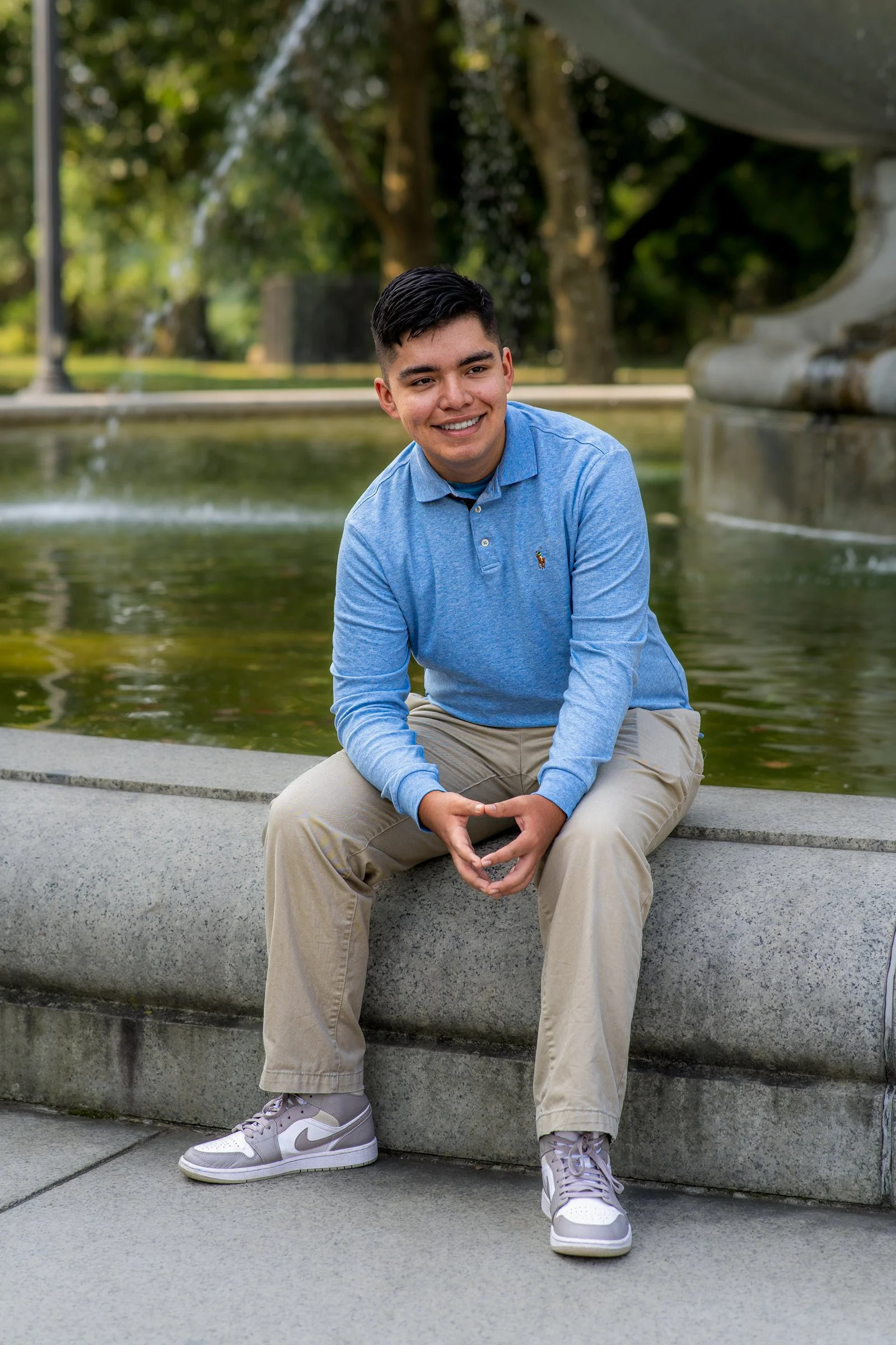 A young man with dark hair, wearing a light blue long-sleeve polo shirt, khaki pants, and gray Nike sneakers, sitting on the edge of a stone fountain in a park with trees in the background.