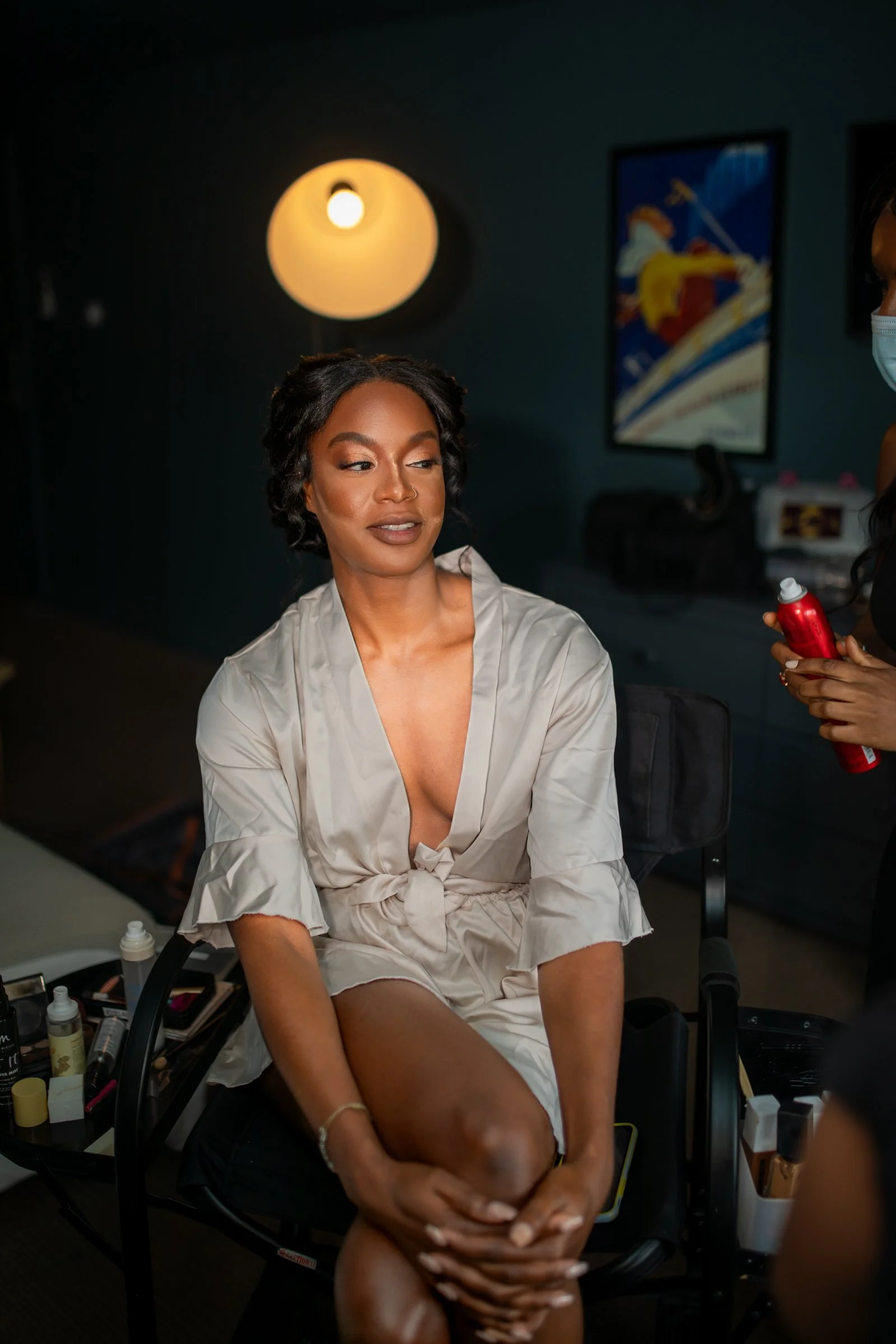A woman sitting in a chair getting her makeup done, wearing a light-colored satin robe, with a makeup artist holding a red hair spray in her hand.